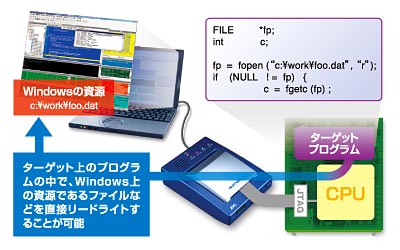 | デバッガと連携する VLINK対応ライブラリ PARTNER-Jetと組み合わせて利用することにより、作成したソフトウェアとデバッグしているパソコンのリソースとの連携が可能になります。 ターゲットソフトウェアで、パソコンを利用した標準入出力やファイルI/Oなどが利用可能になります。 |