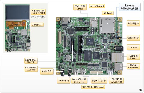 ルネサスエレクトロニクス社のR-Mobile APE5Rを搭載した評価ボードです。